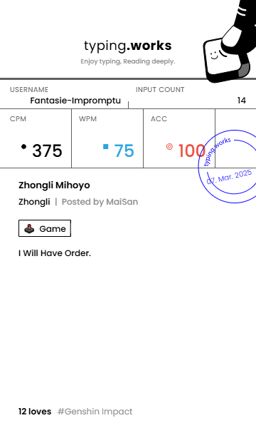 typing 타이핑연습 일지 [示]Etude 2025. 3. 7. 00:01 공유하기 게시글 관리 Ἄλφα καὶ τὸ Ὦ 저작자표시 비영리 변경금지 (새창열림) 'typing' 카테고리의 다른 글 타이핑연습 일지 (0) 2025.03.08 타이핑연습 일지 (0) 2025.03.07 타이핑연습 일지 (0) 2025.03.05 타이핑연습 일지 (0) 2025.03.04 타이핑연습 일지 (0) 2025.03.04 'typing' Related Articles 타이핑연습 일지 타이핑연습 일지 타이핑연습 일지 타이핑연습 일지