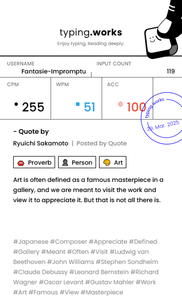 typing 타이핑연습 일지 [示]Etude 2025. 3. 29. 20:21 공유하기 게시글 관리 Ἄλφα καὶ τὸ Ὦ 저작자표시 비영리 변경금지 (새창열림) 'typing' 카테고리의 다른 글 타이핑연습 일지 (0) 2025.03.31 타이핑연습 일지 (0) 2025.03.30 타이핑연습 일지 (0) 2025.03.28 타이핑연습 일지 (0) 2025.03.27 타이핑연습 일지 (0) 2025.03.26 'typing' Related Articles 타이핑연습 일지 타이핑연습 일지 타이핑연습 일지 타이핑연습 일지