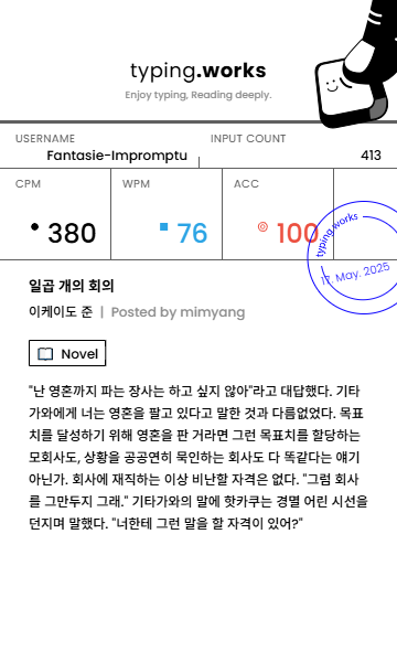 typing 타이핑연습 일지 [示]Etude 2025. 5. 17. 20:19 공유하기 게시글 관리 Ἄλφα καὶ τὸ Ὦ 저작자표시 비영리 변경금지 (새창열림) 'typing' 카테고리의 다른 글 타이핑연습 일지 (0) 2025.05.19 타이핑연습 일지 (0) 2025.05.18 타이핑연습 일지 (0) 2025.05.16 타이핑연습 일지 (0) 2025.05.15 타이핑연습 일지 (0) 2025.05.14 'typing' Related Articles 타이핑연습 일지 타이핑연습 일지 타이핑연습 일지 타이핑연습 일지