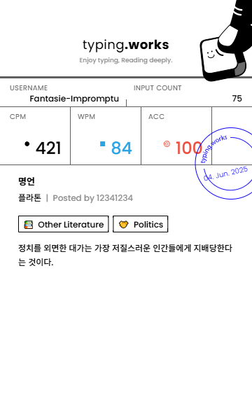 typing 타이핑연습 일지 [示]Etude 2025. 6. 4. 20:28 공유하기 게시글 관리 Ἄλφα καὶ τὸ Ὦ 저작자표시 비영리 변경금지 (새창열림) 'typing' 카테고리의 다른 글 타이핑연습 일지 (0) 2025.06.06 타이핑연습 일지 (0) 2025.06.05 타이핑연습 일지 (0) 2025.06.03 타이핑연습 일지 (0) 2025.06.02 타이핑연습 일지 (0) 2025.06.01 'typing' Related Articles 타이핑연습 일지 타이핑연습 일지 타이핑연습 일지 타이핑연습 일지