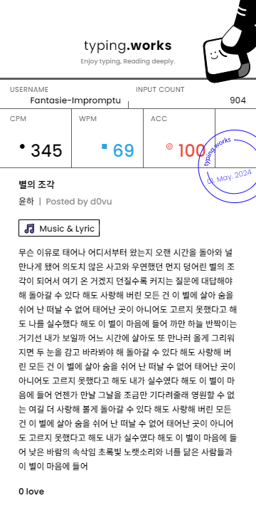 typing 타이핑연습 일지 [示]Etude 2024. 5. 1. 23:27 공유하기 게시글 관리 Ἄλφα καὶ τὸ Ὦ 저작자표시 (새창열림) 'typing' 카테고리의 다른 글 타이핑연습 일지 (0) 2024.05.04 타이핑연습 일지 (0) 2024.05.03 타이핑연습 일지 (0) 2024.04.30 타이핑연습 일지 (0) 2024.04.29 타이핑연습 일지 (0) 2024.04.28 'typing' Related Articles 타이핑연습 일지 타이핑연습 일지 타이핑연습 일지 타이핑연습 일지