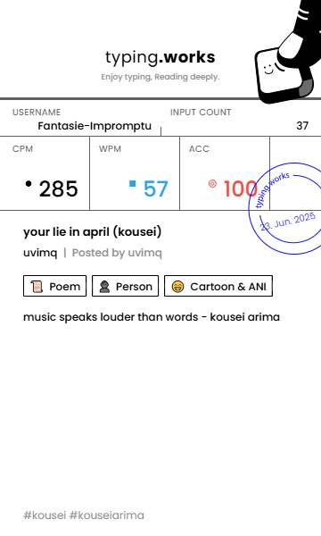 typing 타이핑연습 일지 [示]Etude 2025. 6. 23. 22:59 공유하기 게시글 관리 Ἄλφα καὶ τὸ Ὦ 저작자표시 비영리 변경금지 (새창열림) 'typing' 카테고리의 다른 글 타이핑연습 일지 (0) 2025.06.26 타이핑연습 일지 (0) 2025.06.24 타이핑연습 일지 (0) 2025.06.22 타이핑연습 일지 (0) 2025.06.21 타이핑연습 일지 (0) 2025.06.20 'typing' Related Articles 타이핑연습 일지 타이핑연습 일지 타이핑연습 일지 타이핑연습 일지
