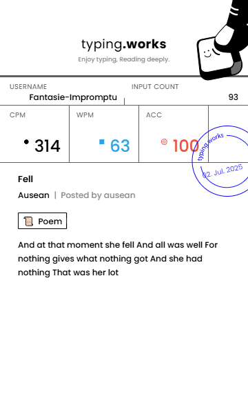typing 타이핑연습 일지 [示]Etude 2025. 7. 2. 20:24 공유하기 게시글 관리 Ἄλφα καὶ τὸ Ὦ 저작자표시 비영리 변경금지 (새창열림) 'typing' 카테고리의 다른 글 타이핑연습 일지 (0) 2025.07.04 타이핑연습 일지 (0) 2025.07.03 타이핑연습 일지 (0) 2025.07.02 타이핑연습 일지 (0) 2025.06.30 타이핑연습 일지 (0) 2025.06.29 'typing' Related Articles 타이핑연습 일지 타이핑연습 일지 타이핑연습 일지 타이핑연습 일지