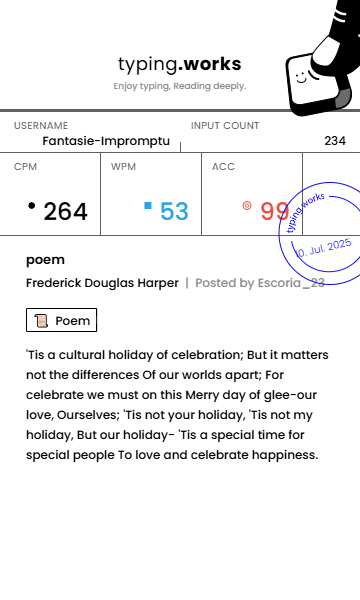 typing 타이핑연습 일지 [示]Etude 2025. 7. 10. 23:36 공유하기 게시글 관리 Ἄλφα καὶ τὸ Ὦ 저작자표시 비영리 변경금지 (새창열림) 'typing' 카테고리의 다른 글 타이핑연습 일지 (0) 2025.07.12 타이핑연습 일지 (0) 2025.07.11 타이핑연습 일지 (0) 2025.07.09 타이핑연습 일지 (0) 2025.07.08 타이핑연습 일지 (0) 2025.07.08 'typing' Related Articles 타이핑연습 일지 타이핑연습 일지 타이핑연습 일지 타이핑연습 일지