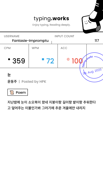 typing 타이핑연습 일지 [示]Etude 2025. 8. 8. 22:25 공유하기 게시글 관리 Ἄλφα καὶ τὸ Ὦ 저작자표시 비영리 변경금지 (새창열림) 'typing' 카테고리의 다른 글 타이핑연습 일지 (0) 2025.08.10 타이핑연습 일지 (1) 2025.08.09 타이핑연습 일지 (0) 2025.08.07 타이핑연습 일지 (0) 2025.08.06 타이핑연습 일지 (0) 2025.08.05 'typing' Related Articles 타이핑연습 일지 타이핑연습 일지 타이핑연습 일지 타이핑연습 일지
