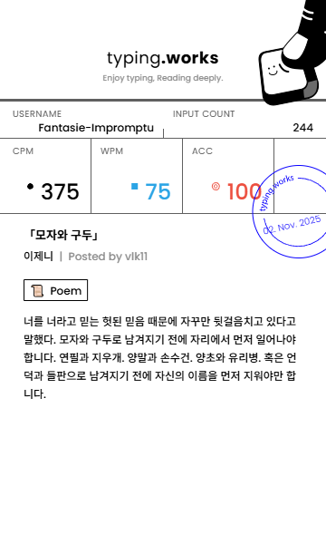 typing 타이핑연습 일지 [示]Etude 2025. 11. 2. 21:12 공유하기 게시글 관리 Ἄλφα καὶ τὸ Ὦ 저작자표시 비영리 변경금지 (새창열림) 'typing' 카테고리의 다른 글 타이핑연습 일지 (0) 2025.11.04 타이핑연습 일지 (0) 2025.11.03 타이핑연습 일지 (0) 2025.11.01 타이핑연습 일지 (0) 2025.11.01 타이핑연습 일지 (0) 2025.10.30 'typing' Related Articles 타이핑연습 일지 타이핑연습 일지 타이핑연습 일지 타이핑연습 일지