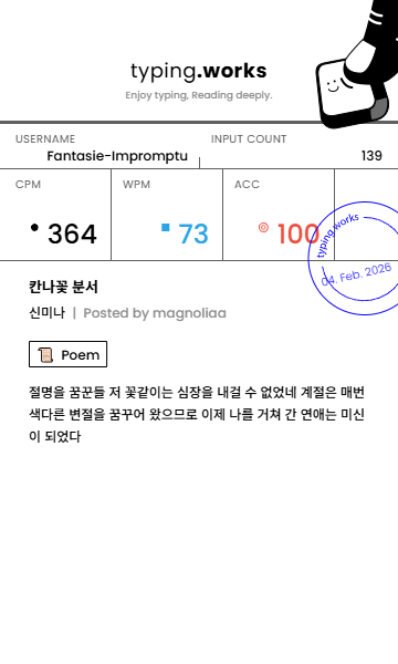 typing 타이핑연습 일지 [示]Etude 2026. 2. 4. 20:15 공유하기 게시글 관리 Ἄλφα καὶ τὸ Ὦ 저작자표시 비영리 변경금지 (새창열림) 'typing' 카테고리의 다른 글 타이핑연습 일지 (0) 2026.02.06 타이핑연습 일지 (0) 2026.02.05 타이핑연습 일지 (0) 2026.02.03 타이핑연습 일지 (0) 2026.02.02 타이핑연습 일지 (0) 2026.02.02 'typing' Related Articles 타이핑연습 일지 타이핑연습 일지 타이핑연습 일지 타이핑연습 일지