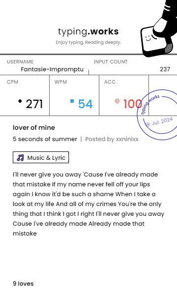 typing 타이핑연습 일지 [示]Etude 2024. 7. 19. 22:59 공유하기 게시글 관리 Ἄλφα καὶ τὸ Ὦ 저작자표시 동일조건 (새창열림) 'typing' 카테고리의 다른 글 타이핑연습 일지 (0) 2024.07.21 타이핑연습 일지 (0) 2024.07.20 타이핑연습 일지 (0) 2024.07.18 타이핑연습 일지 (0) 2024.07.17 타이핑연습 일지 (0) 2024.07.16 'typing' Related Articles 타이핑연습 일지 타이핑연습 일지 타이핑연습 일지 타이핑연습 일지