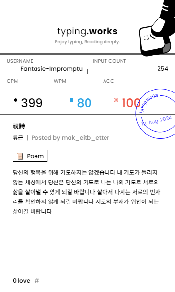 typing 타이핑연습 일지 [示]Etude 2024. 8. 12. 23:12 공유하기 게시글 관리 Ἄλφα καὶ τὸ Ὦ 저작자표시 동일조건 (새창열림) 'typing' 카테고리의 다른 글 타이핑연습 일지 (0) 2024.08.14 타이핑연습 일지 (0) 2024.08.13 타이핑연습 일지 (0) 2024.08.11 타이핑연습 일지 (0) 2024.08.10 타이핑연습 일지 (0) 2024.08.09 'typing' Related Articles 타이핑연습 일지 타이핑연습 일지 타이핑연습 일지 타이핑연습 일지