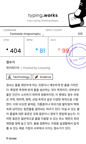 typing 타이핑연습 일지 [示]Etude 2024. 9. 10. 22:59 공유하기 게시글 관리 Ἄλφα καὶ τὸ Ὦ 저작자표시 동일조건 (새창열림) 'typing' 카테고리의 다른 글 타이핑연습 일지 (0) 2024.09.12 타이핑연습 일지 (0) 2024.09.11 타이핑연습 일지 (1) 2024.09.09 타이핑연습 일지 (0) 2024.09.08 타이핑연습 일지 (1) 2024.09.07 'typing' Related Articles 타이핑연습 일지 타이핑연습 일지 타이핑연습 일지 타이핑연습 일지