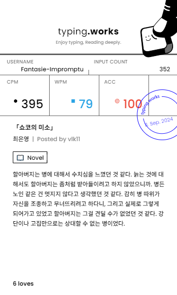 typing 타이핑연습 일지 [示]Etude 2024. 9. 11. 23:10 공유하기 게시글 관리 Ἄλφα καὶ τὸ Ὦ 저작자표시 동일조건 (새창열림) 'typing' 카테고리의 다른 글 타이핑연습 일지 (0) 2024.09.13 타이핑연습 일지 (0) 2024.09.12 타이핑연습 일지 (0) 2024.09.10 타이핑연습 일지 (1) 2024.09.09 타이핑연습 일지 (0) 2024.09.08 'typing' Related Articles 타이핑연습 일지 타이핑연습 일지 타이핑연습 일지 타이핑연습 일지