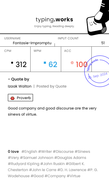 typing 타이핑연습 일지 [示]Etude 2024. 9. 25. 23:00 공유하기 게시글 관리 Ἄλφα καὶ τὸ Ὦ 저작자표시 동일조건 (새창열림) 'typing' 카테고리의 다른 글 타이핑연습 일지 (0) 2024.09.27 타이핑연습 일지 (0) 2024.09.27 타이핑연습 일지 (0) 2024.09.24 타이핑연습 일지 (0) 2024.09.23 타이핑연습 일지 (0) 2024.09.22 'typing' Related Articles 타이핑연습 일지 타이핑연습 일지 타이핑연습 일지 타이핑연습 일지
